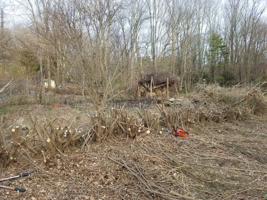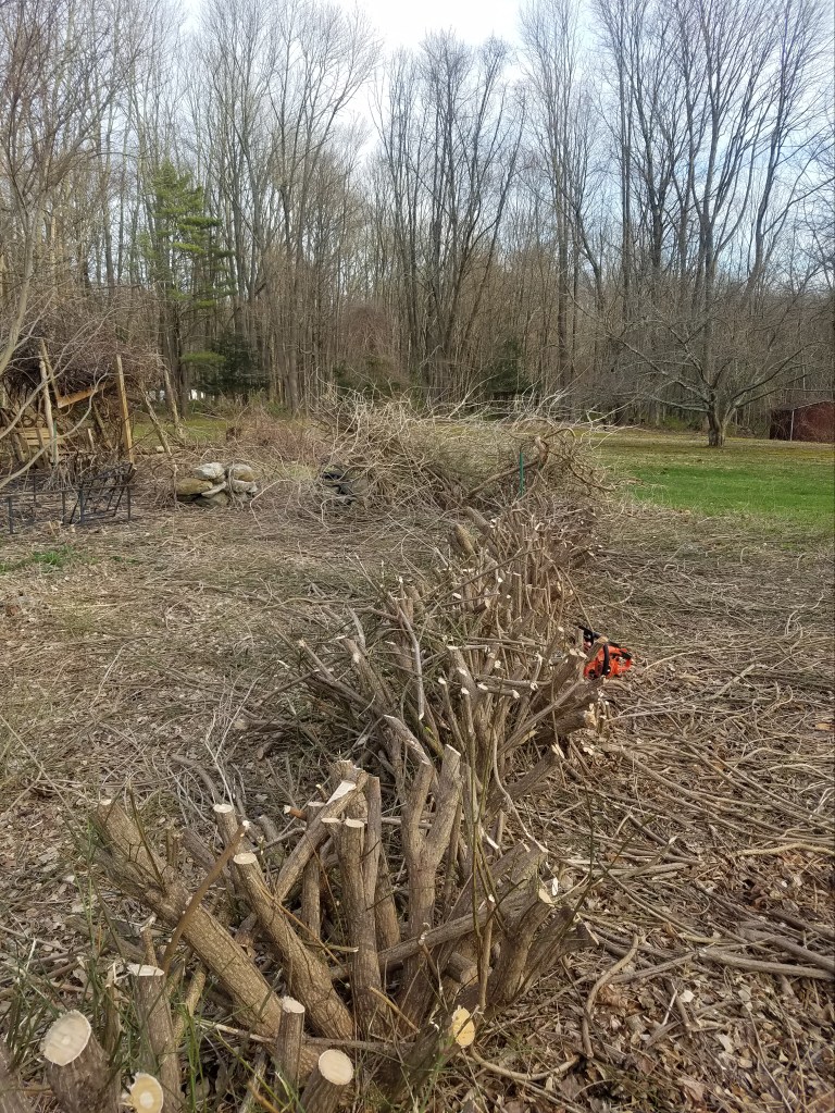 Working in the old Butterfly Garden. Time to tackle the overgrown Burning Bush hedge. Perhaps it won’t be a shade garden. A secret garden still?