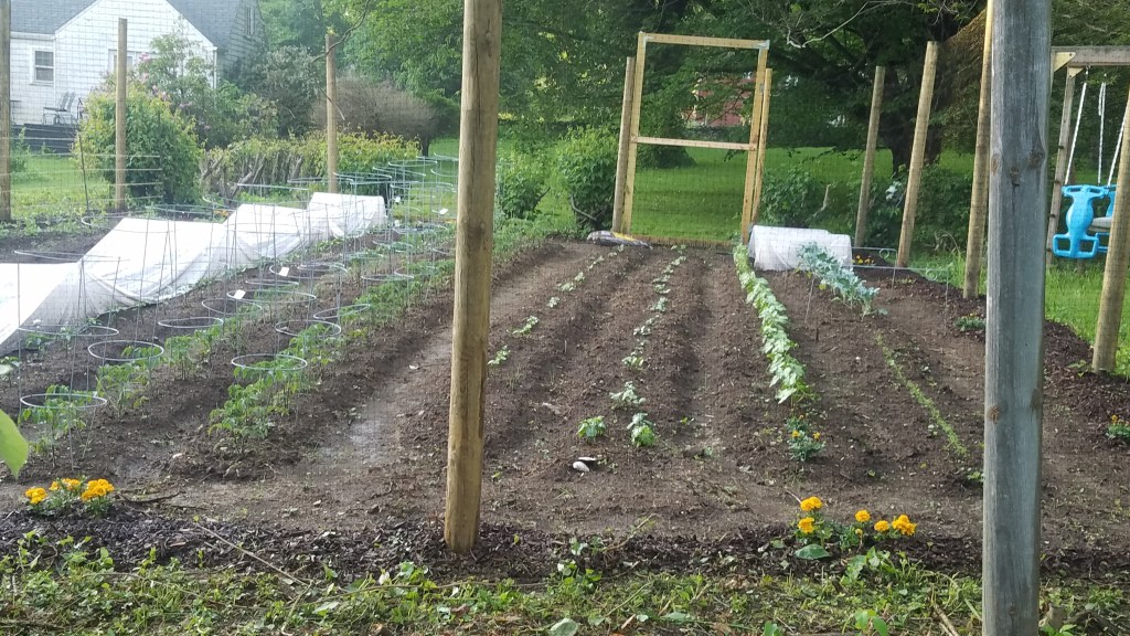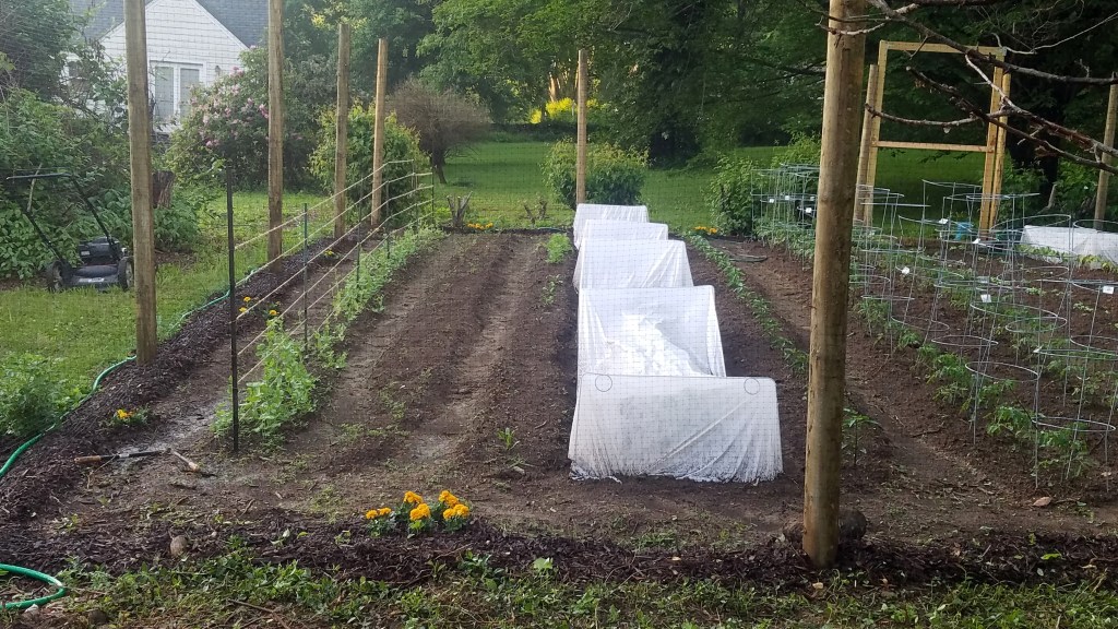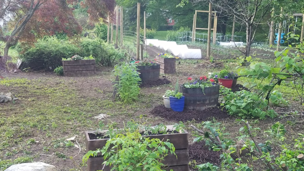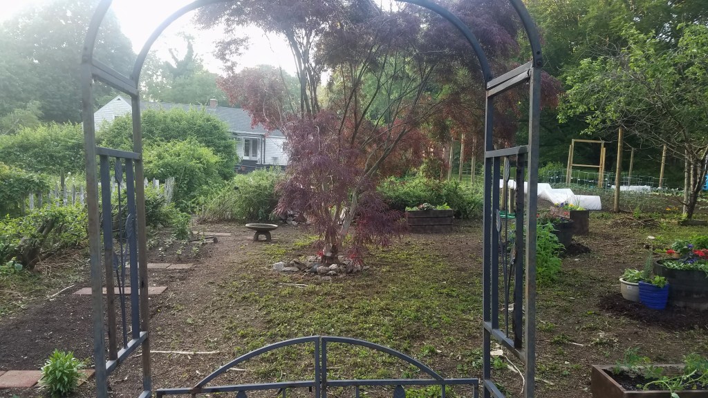 Grass needs to be sowed. A Trellis or Arbor needs to built for the grapes/hardy kiwi and have to figure out how to rebuild the old, fallen down arbor that supports the mature kiwi and make a home for the hops.