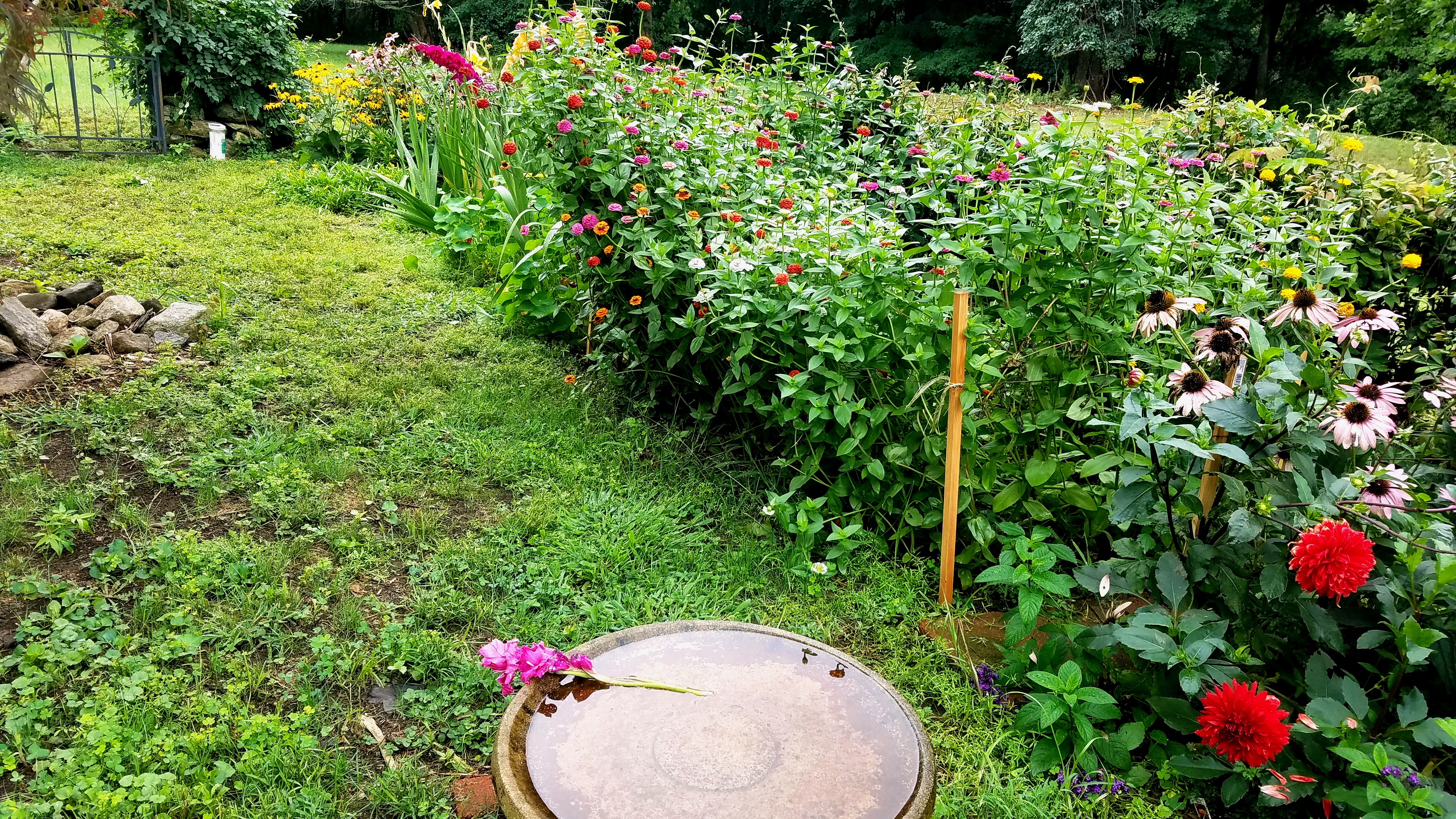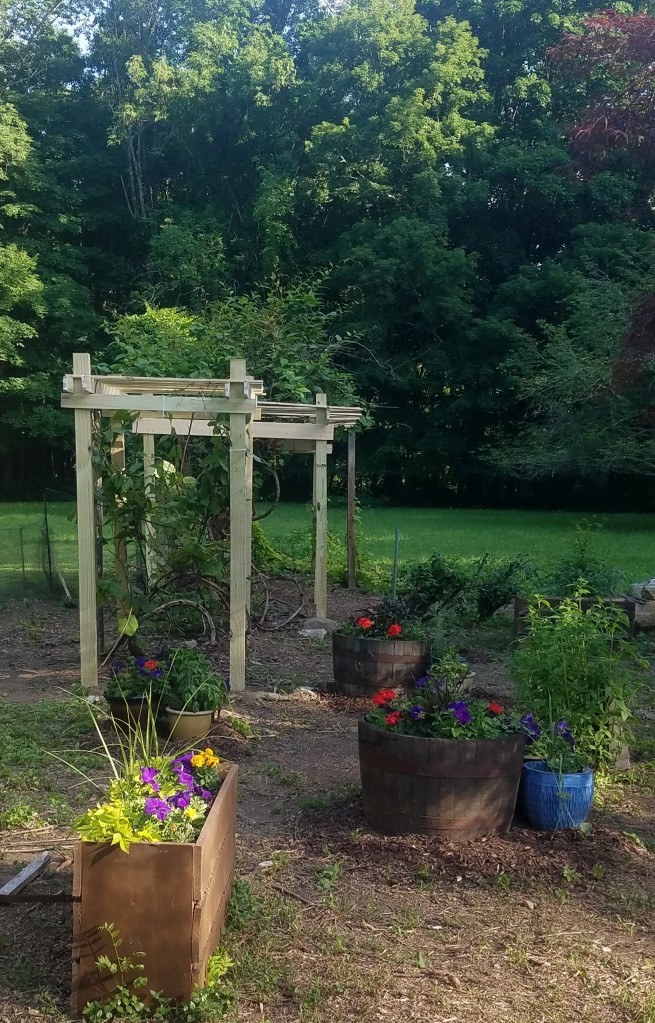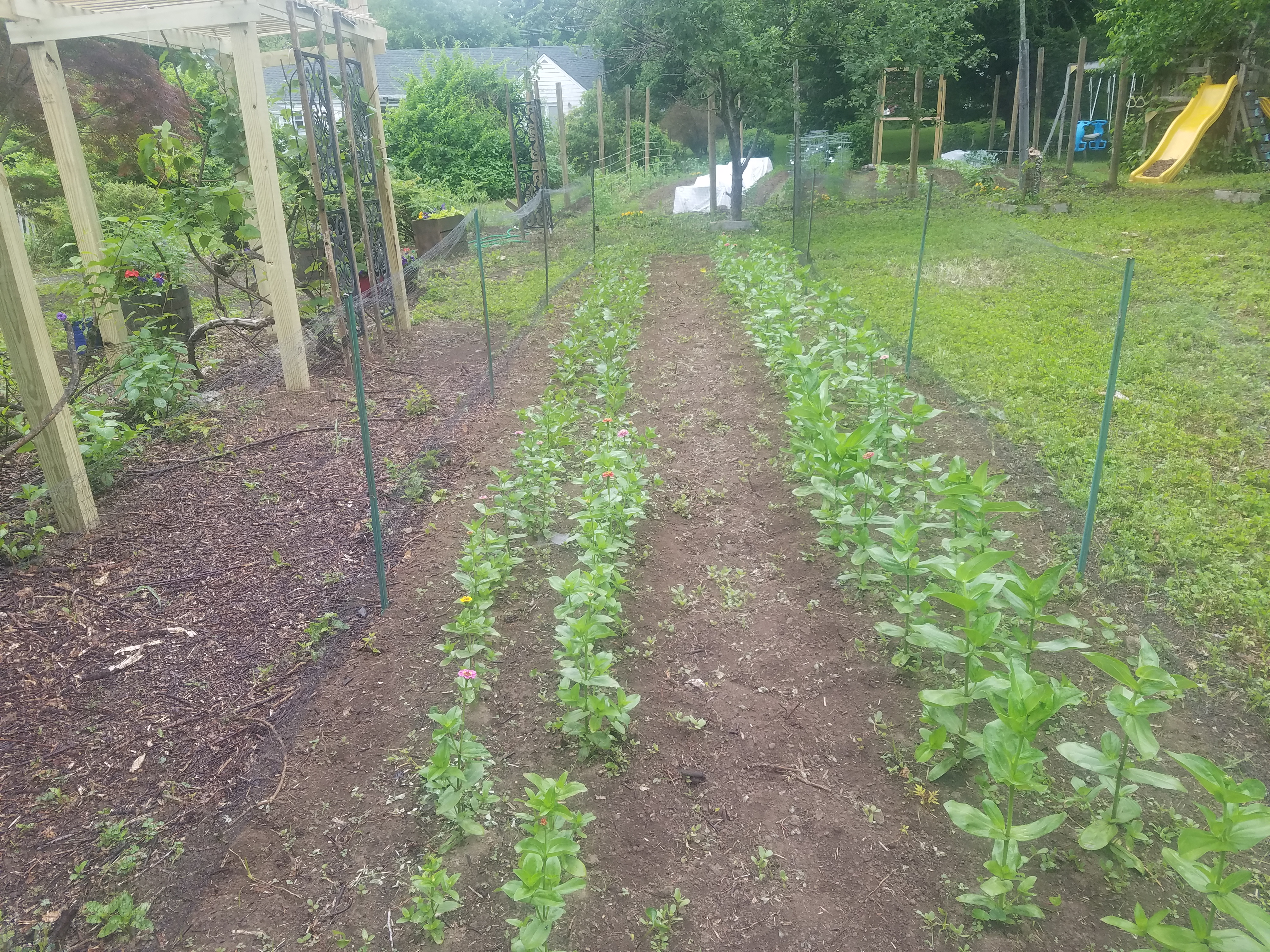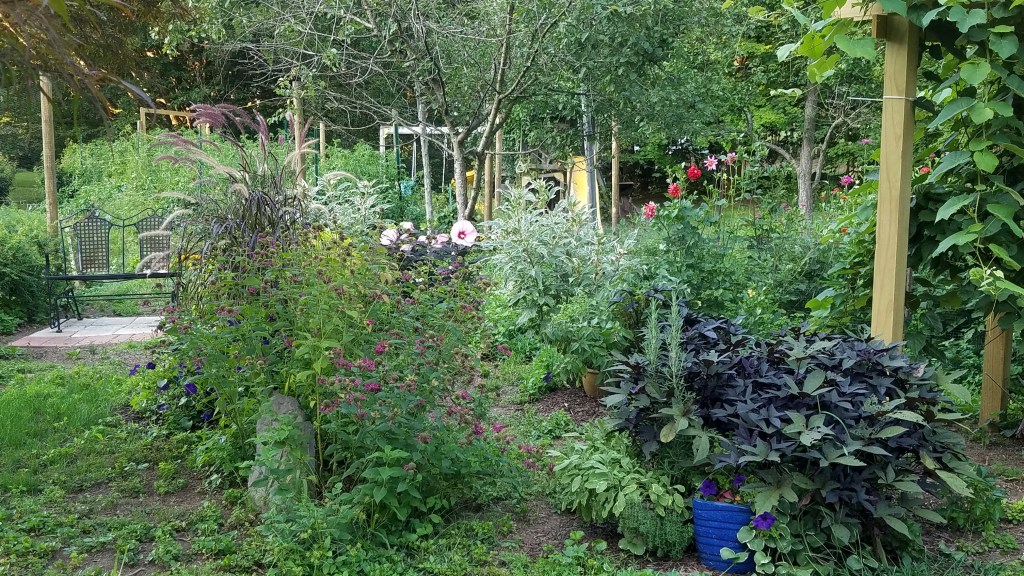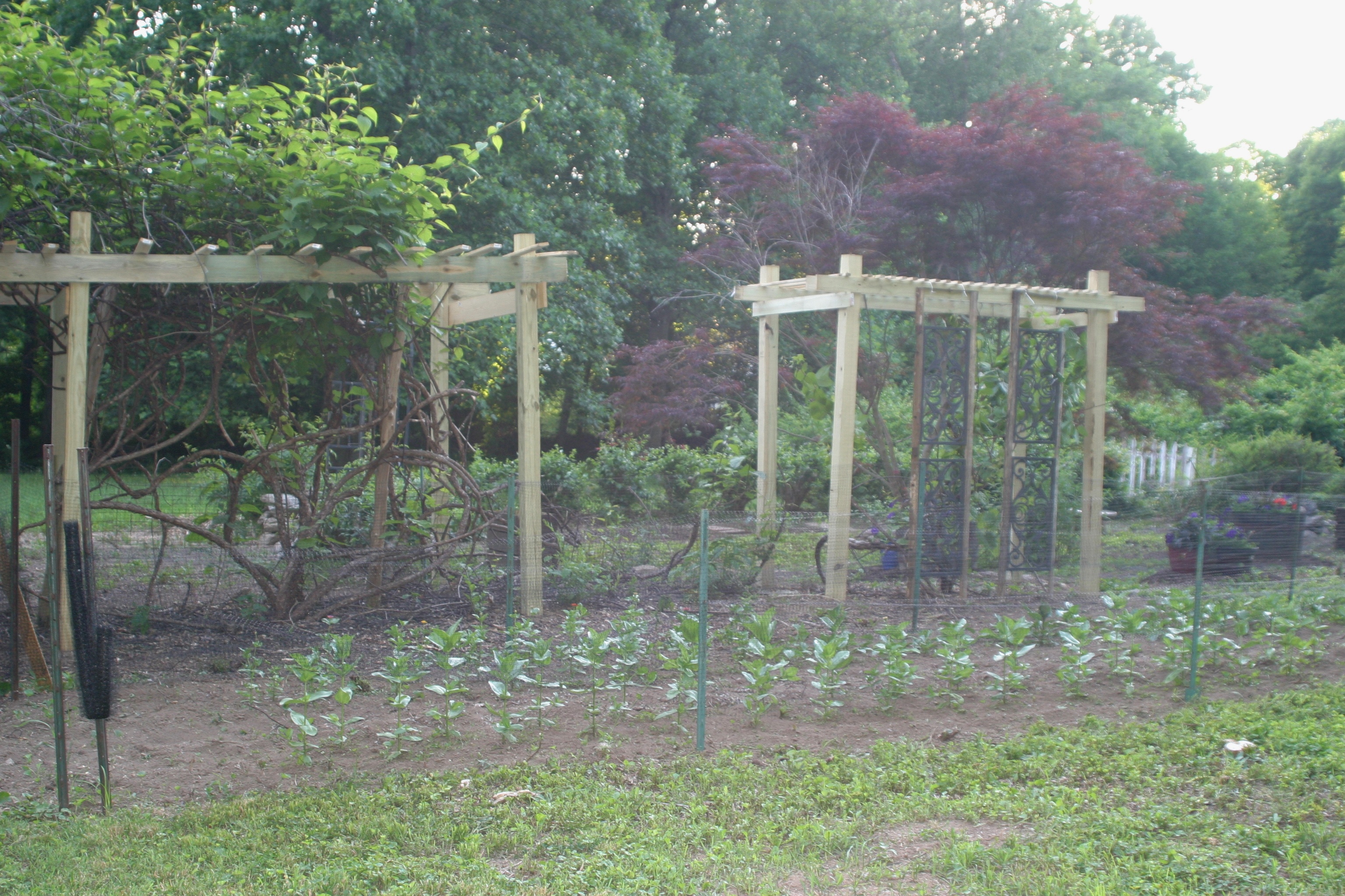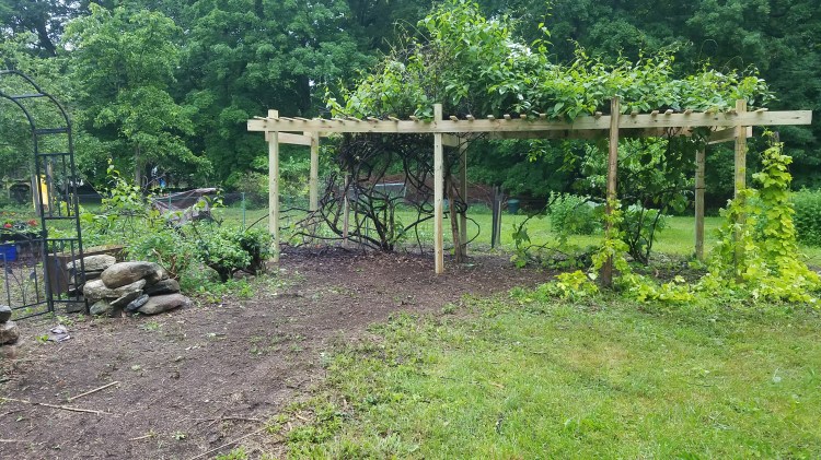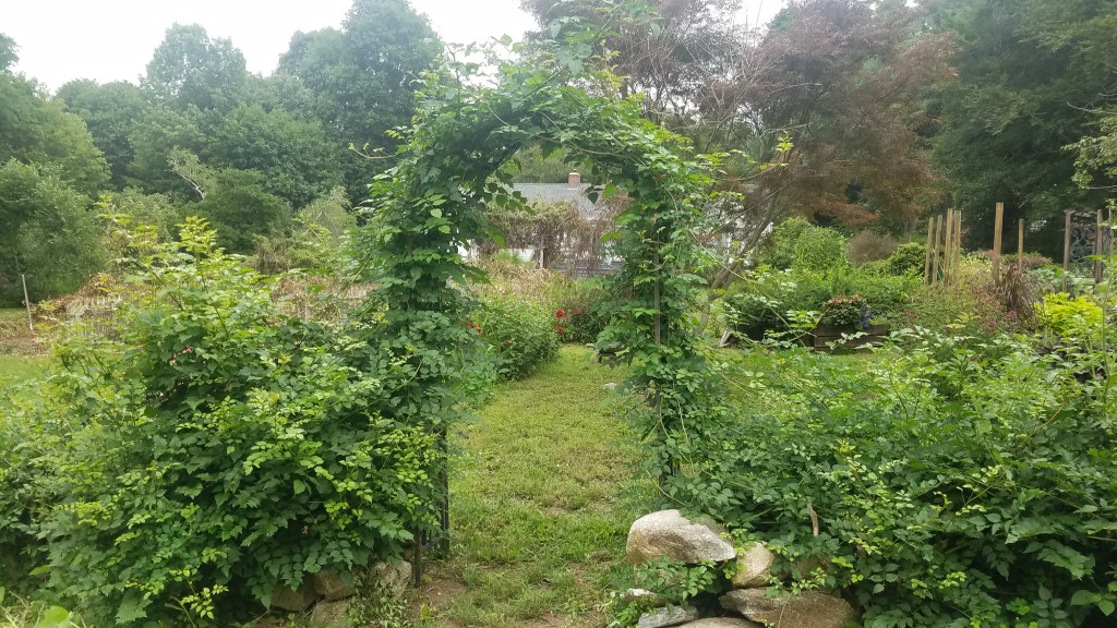 Cut flower bed in old vegetable garden running along rebuilt kiwi arbor and new grape arbor. Artemisia patch and rhubarb.