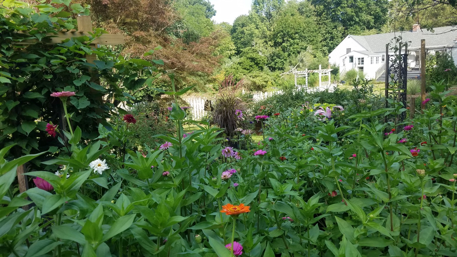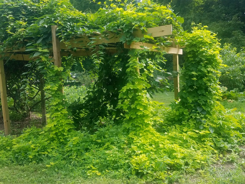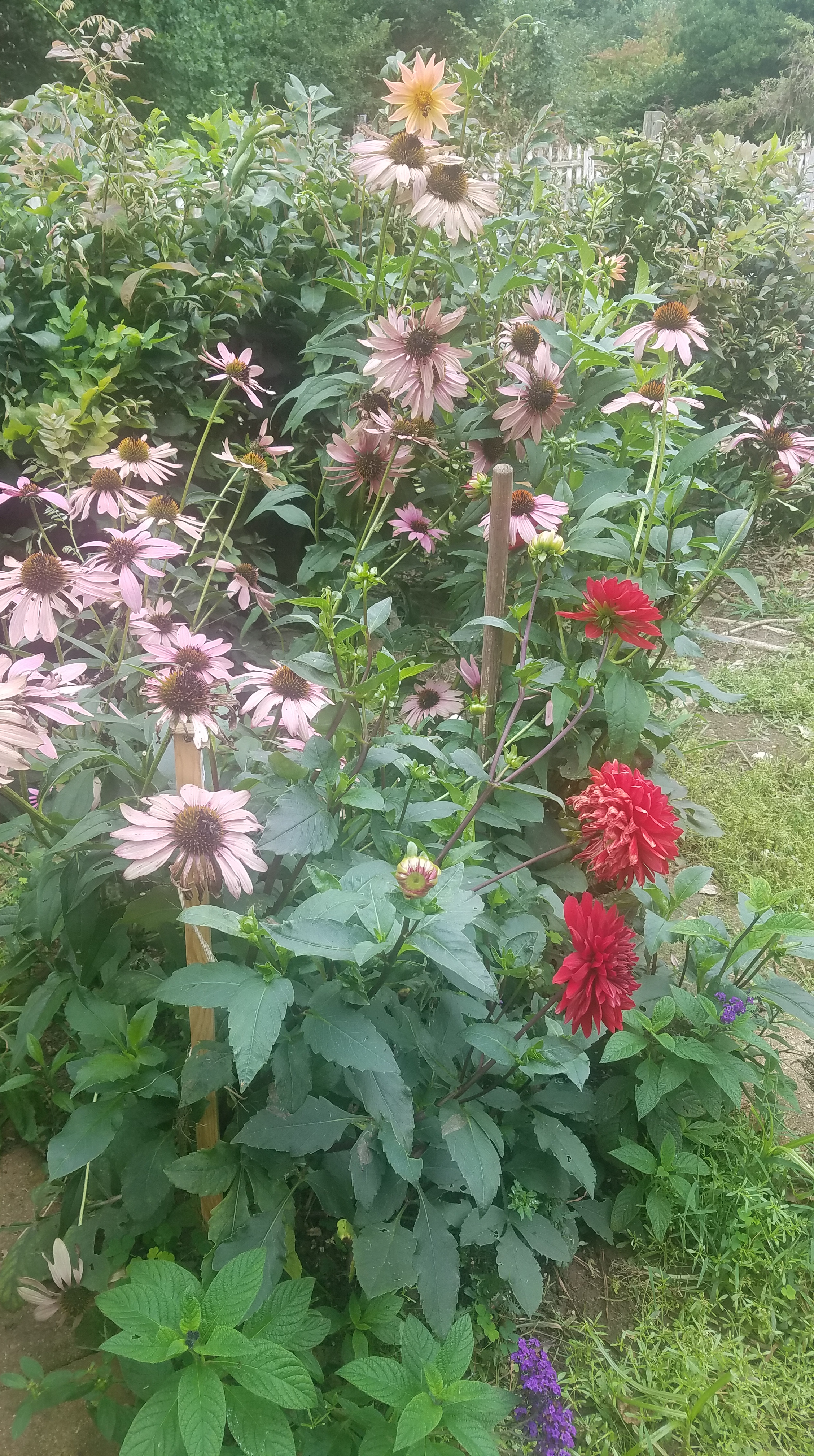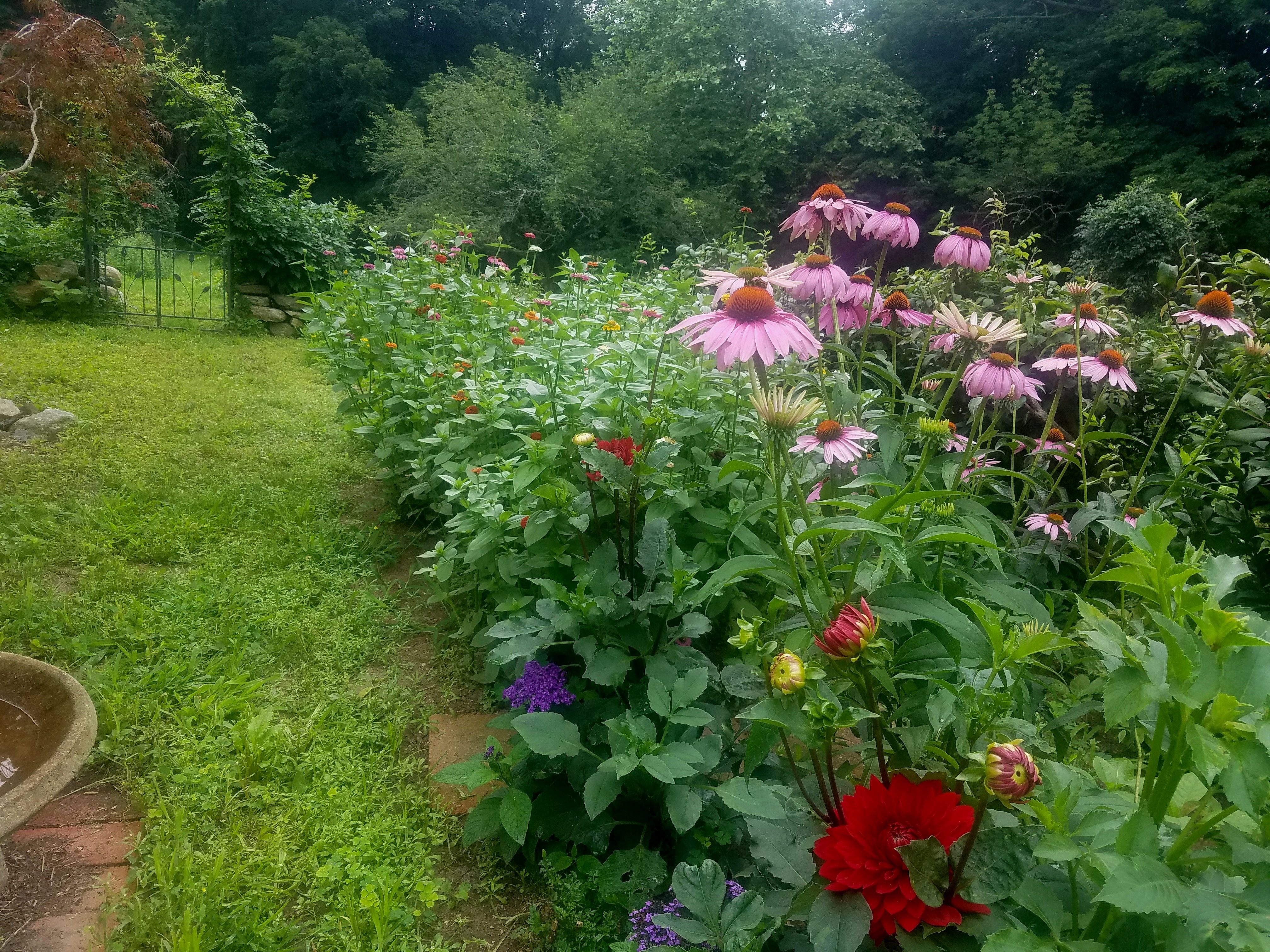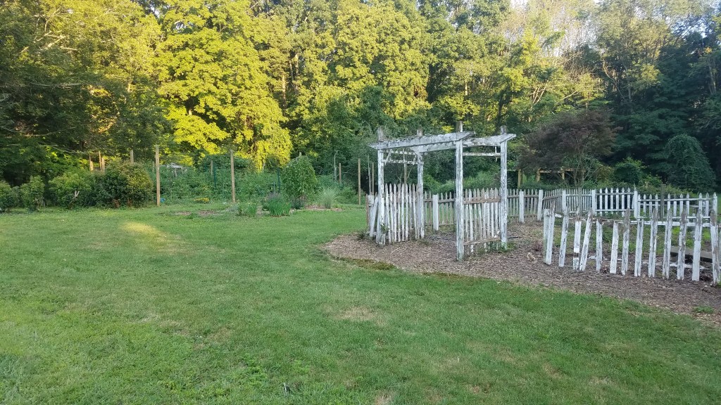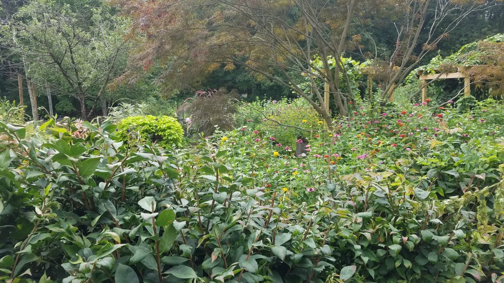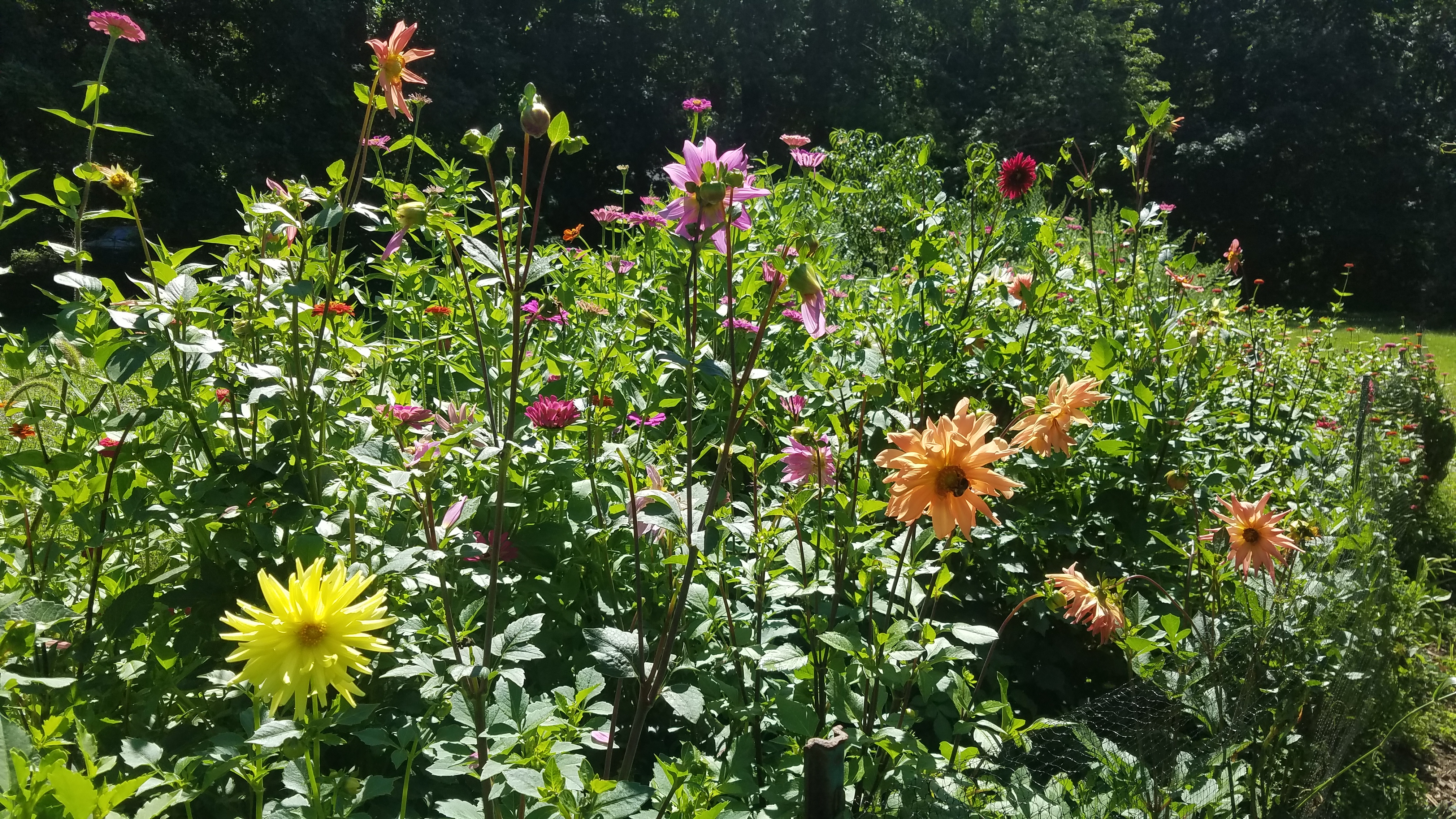 Cut flower bed in old vegetable garden running along rebuilt kiwi arbor and new grape arbor. Artemisia patch and rhubarb.