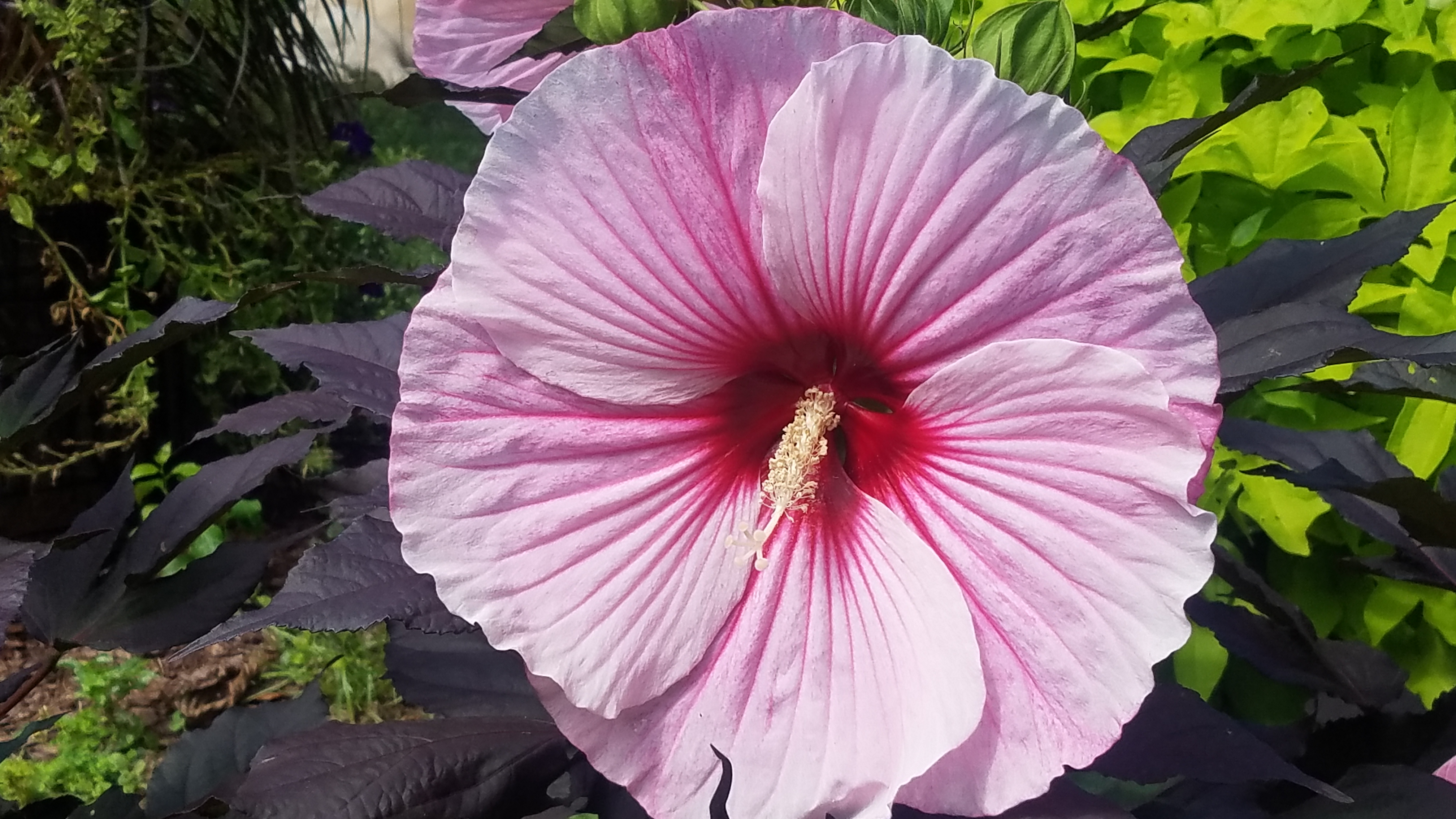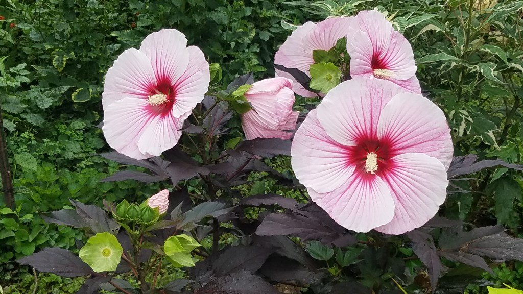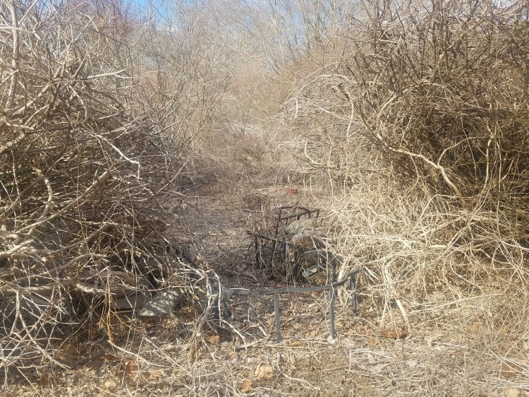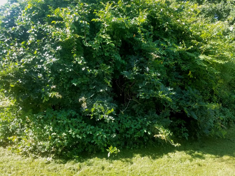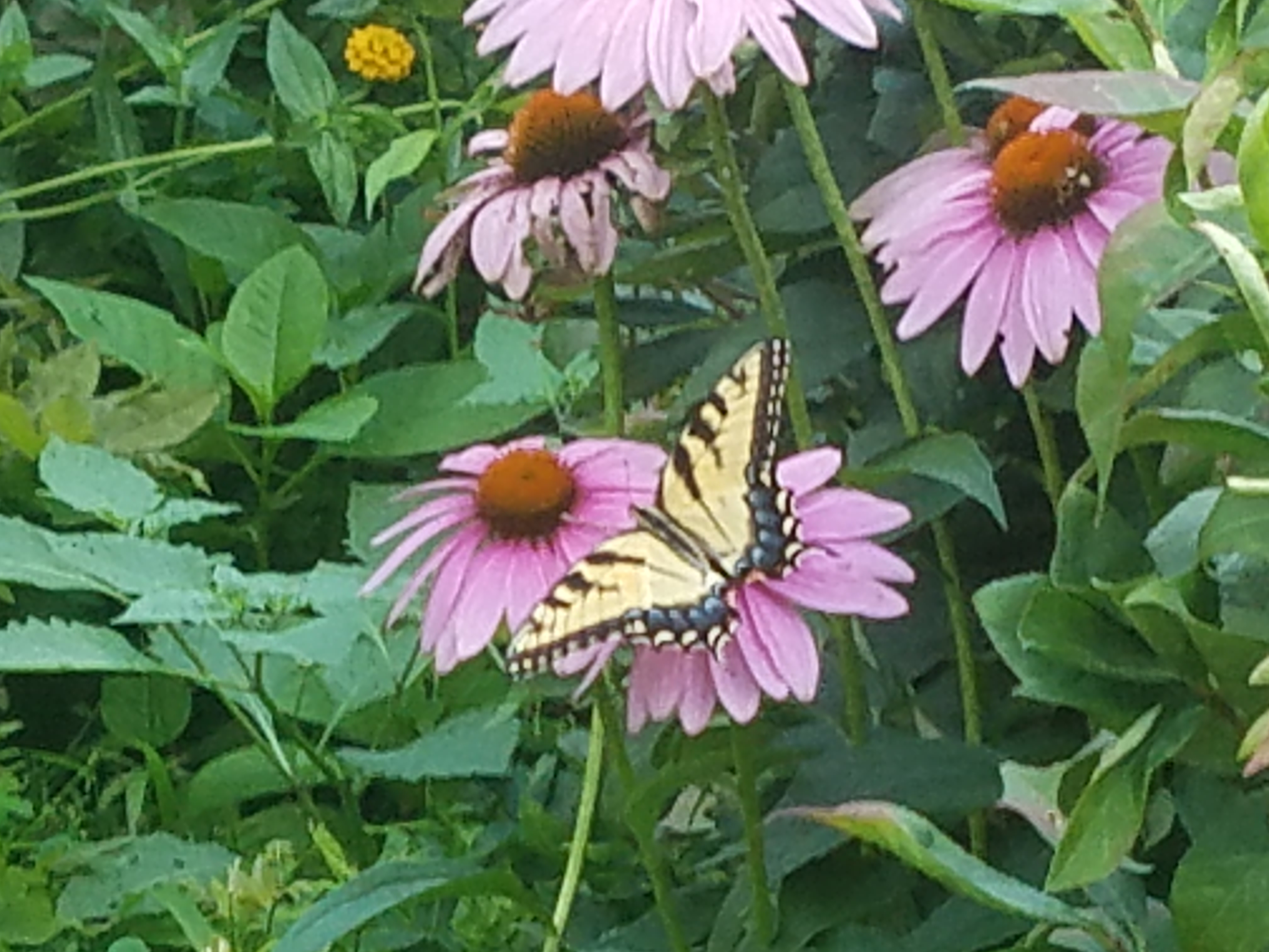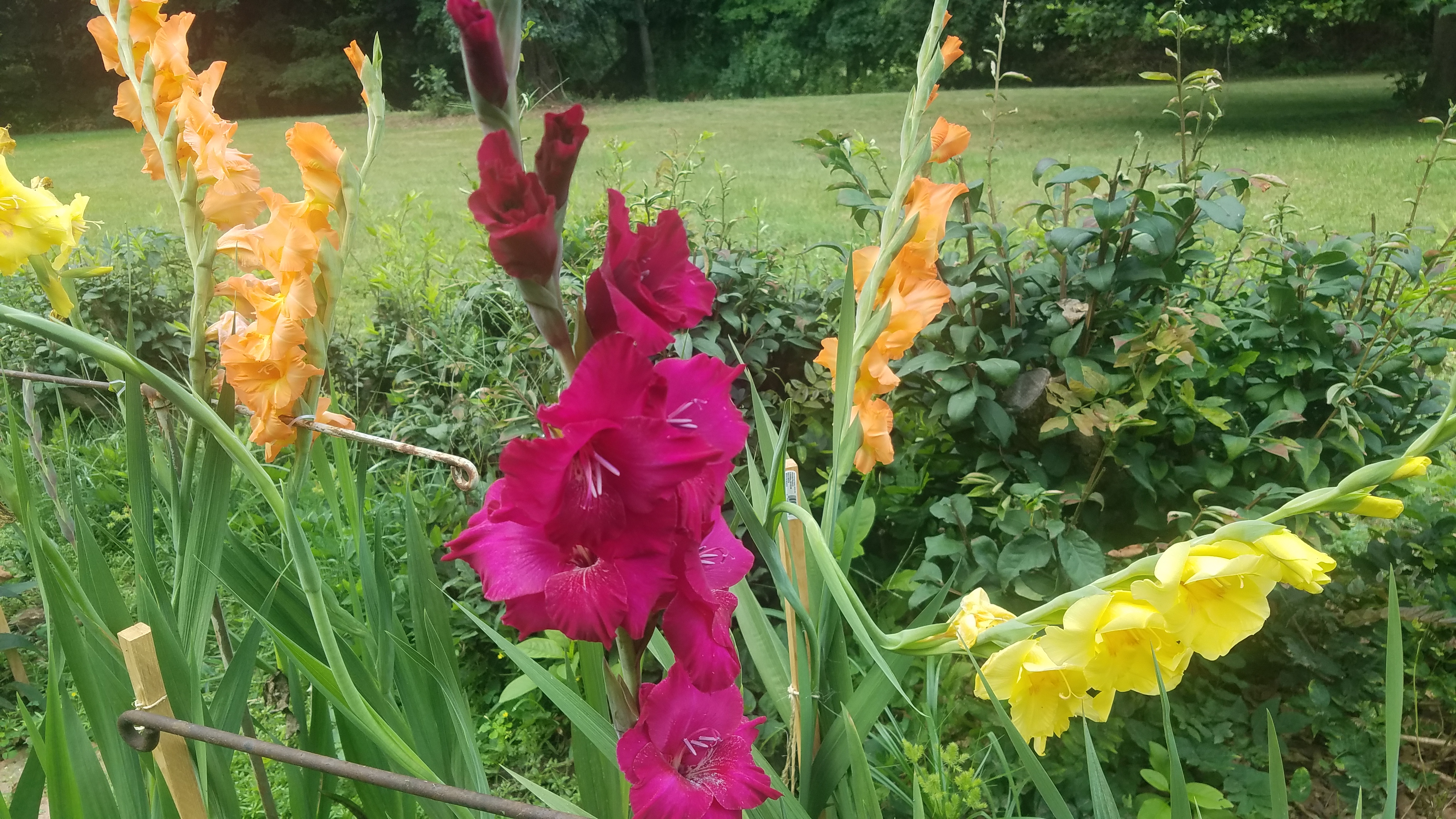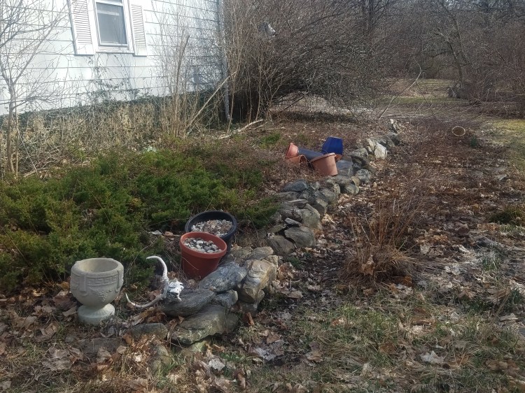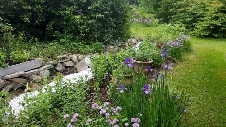 Cut flower bed in old vegetable garden running along rebuilt kiwi arbor and new grape arbor. Artemisia patch and rhubarb.