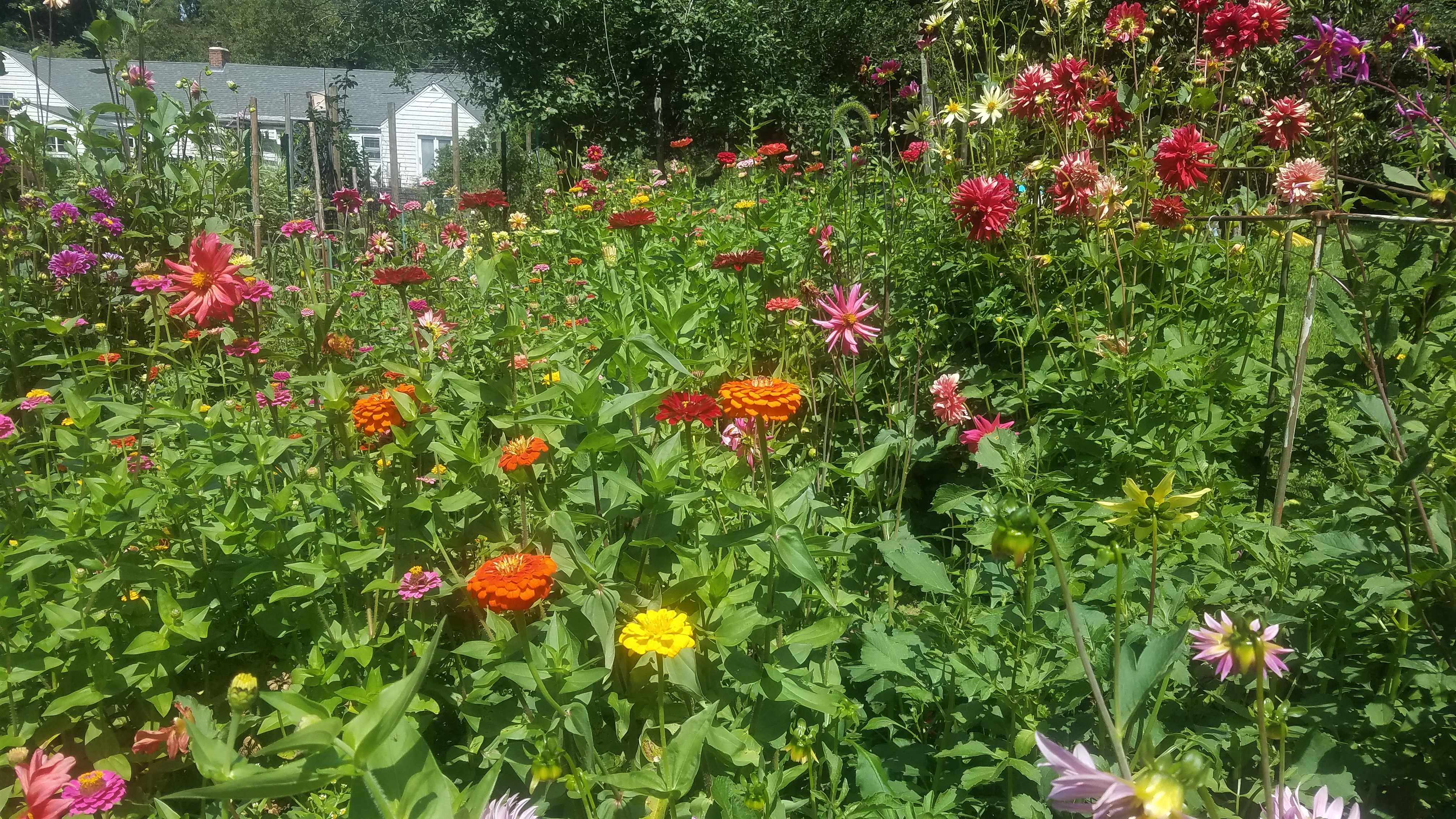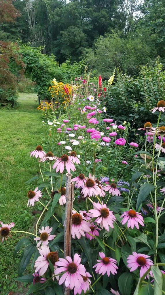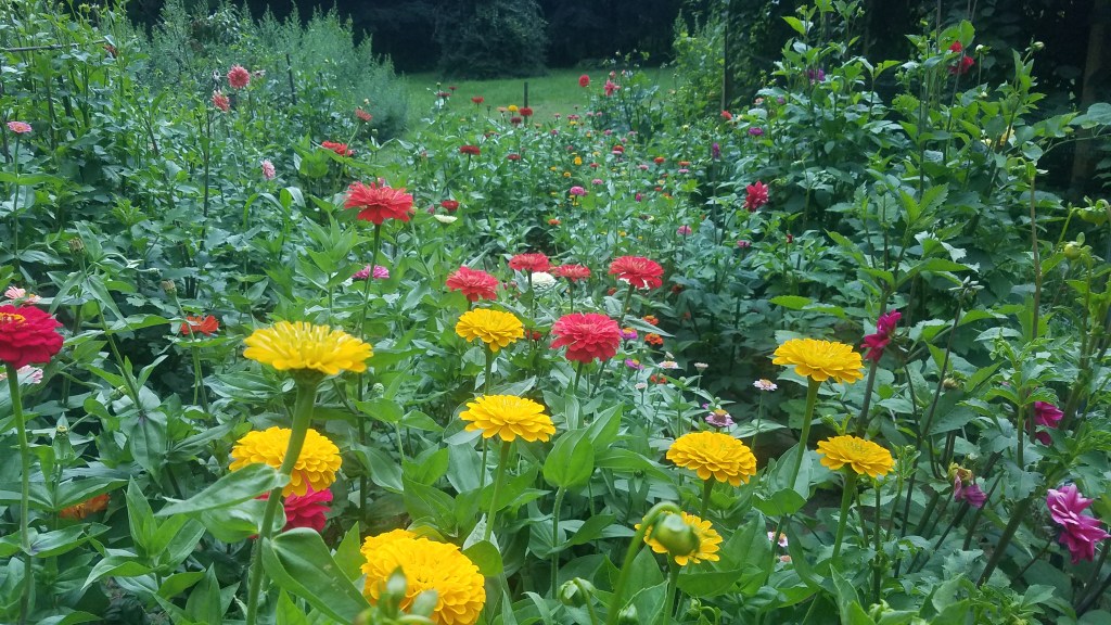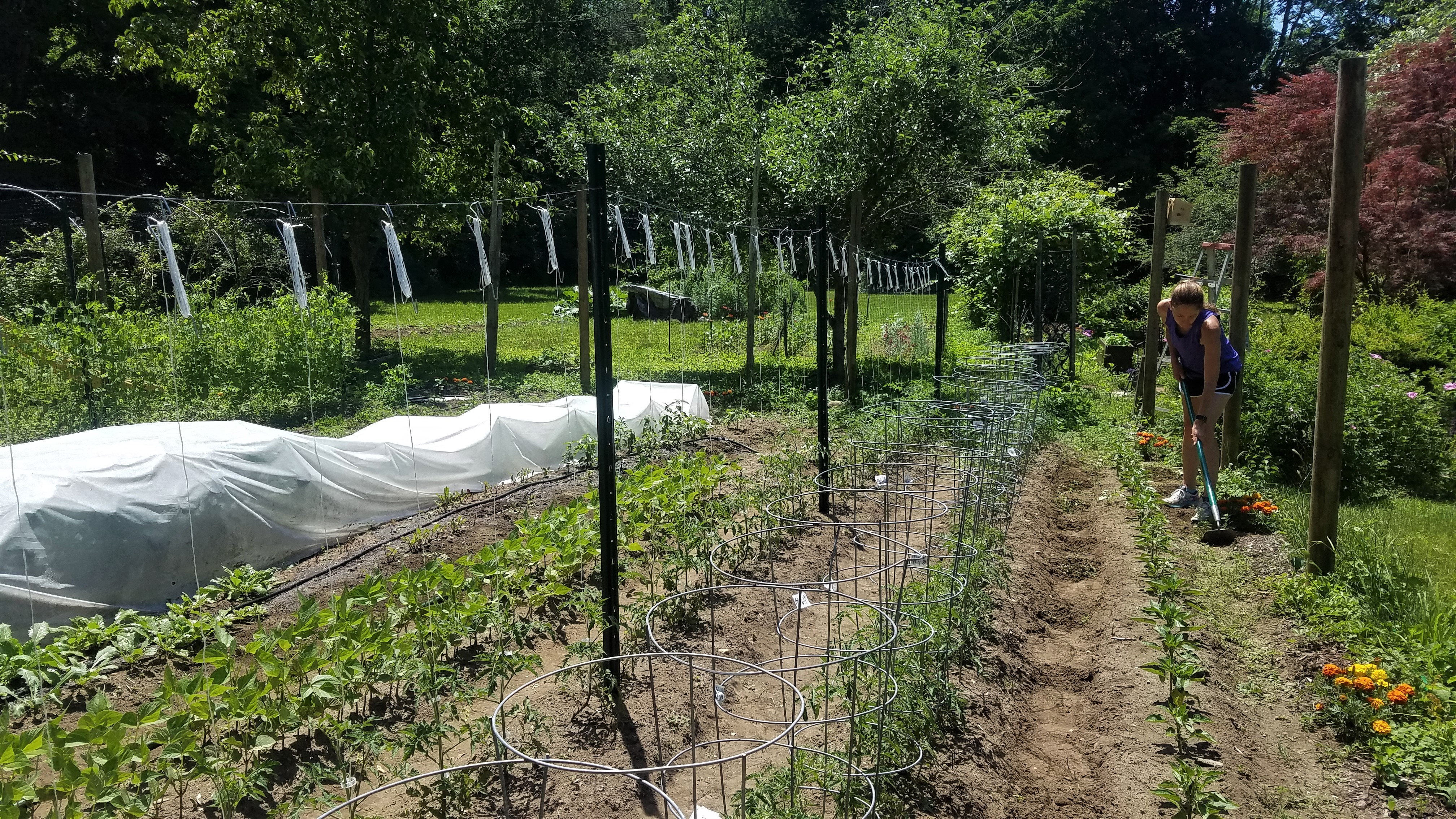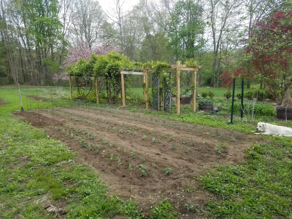 Looking past the cut flower bed towards the kiwi and grape arbors
