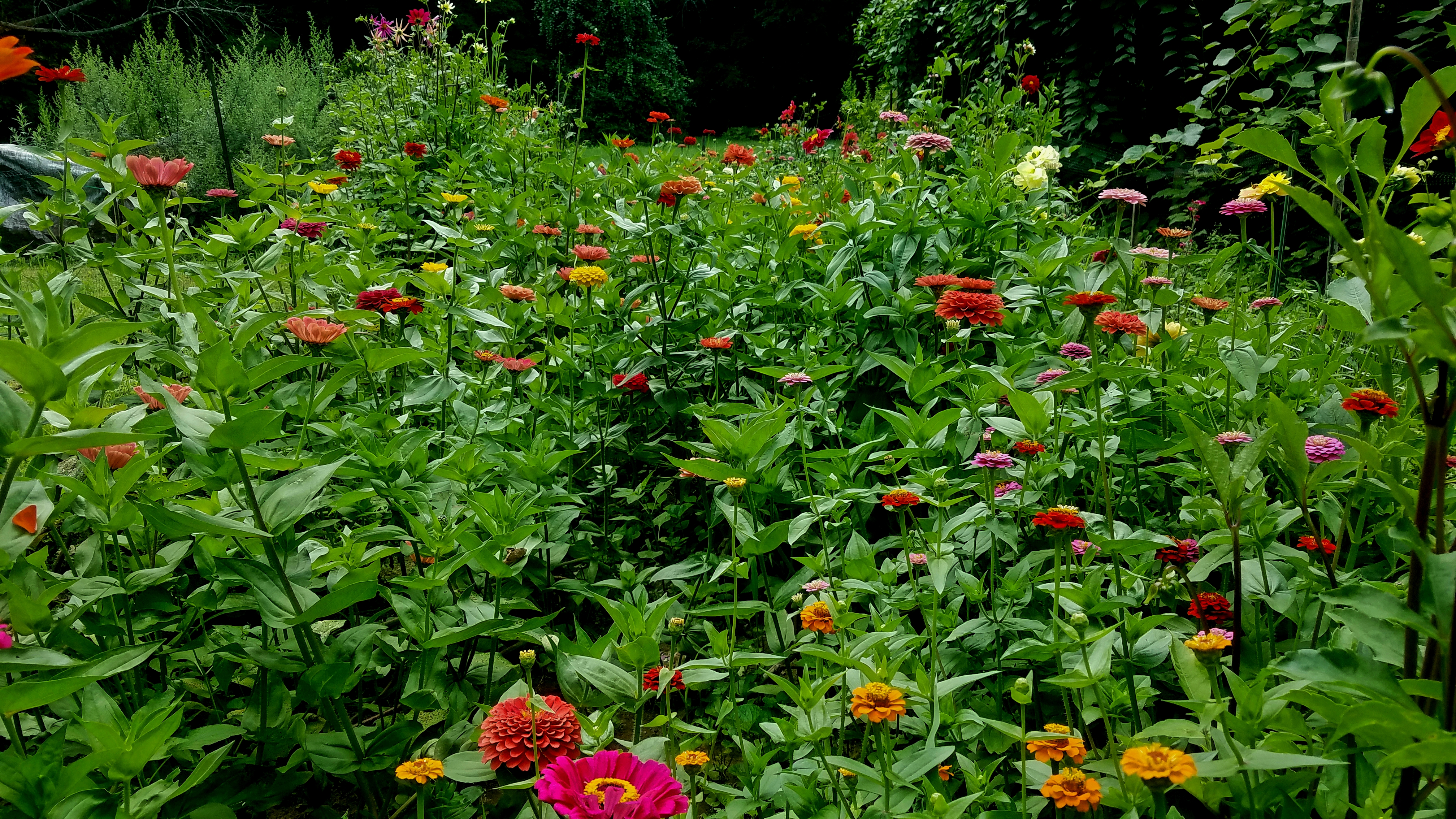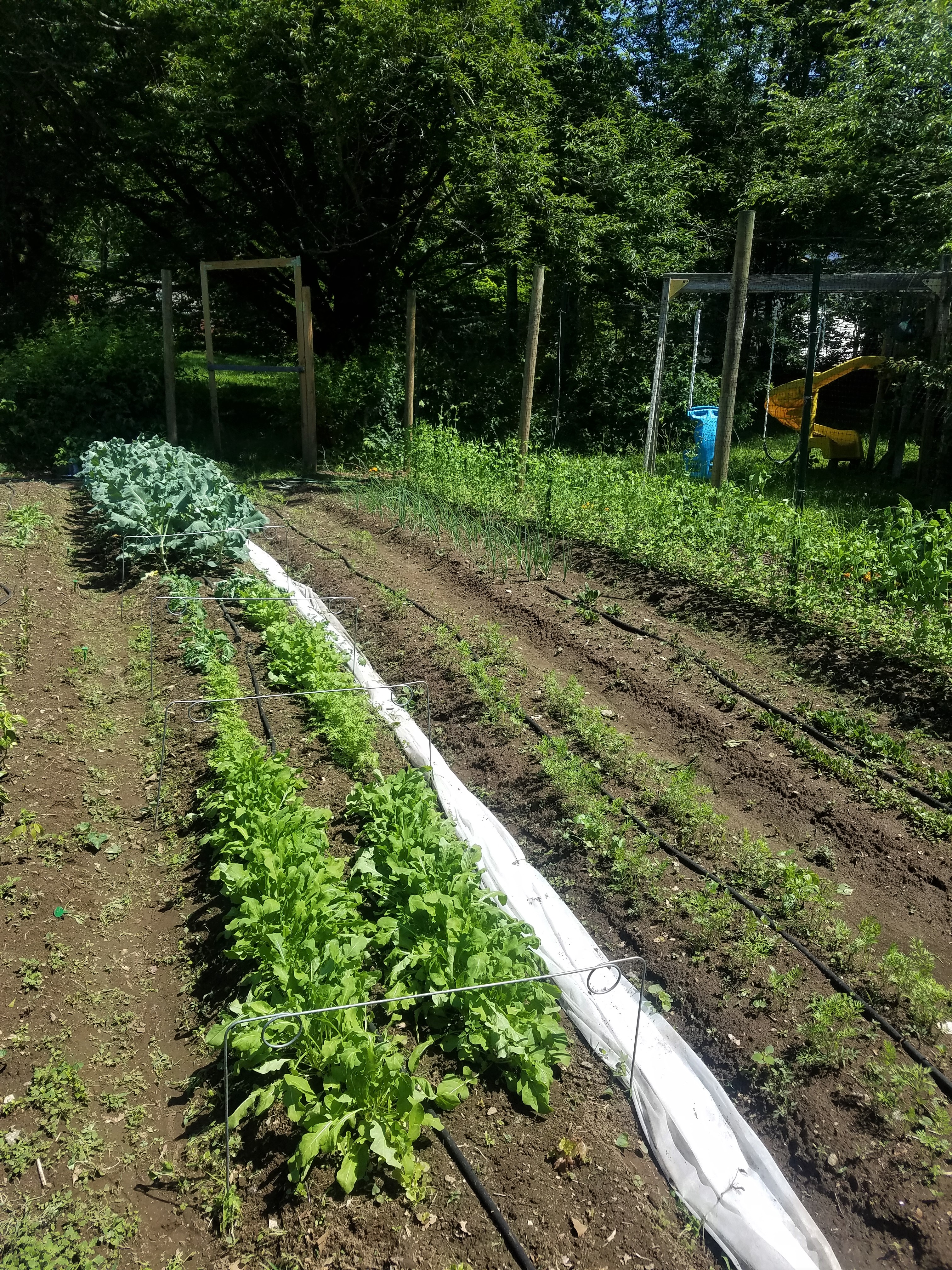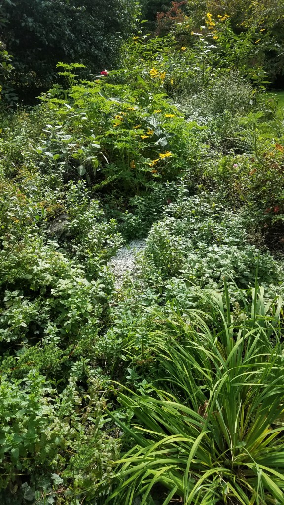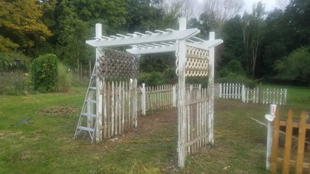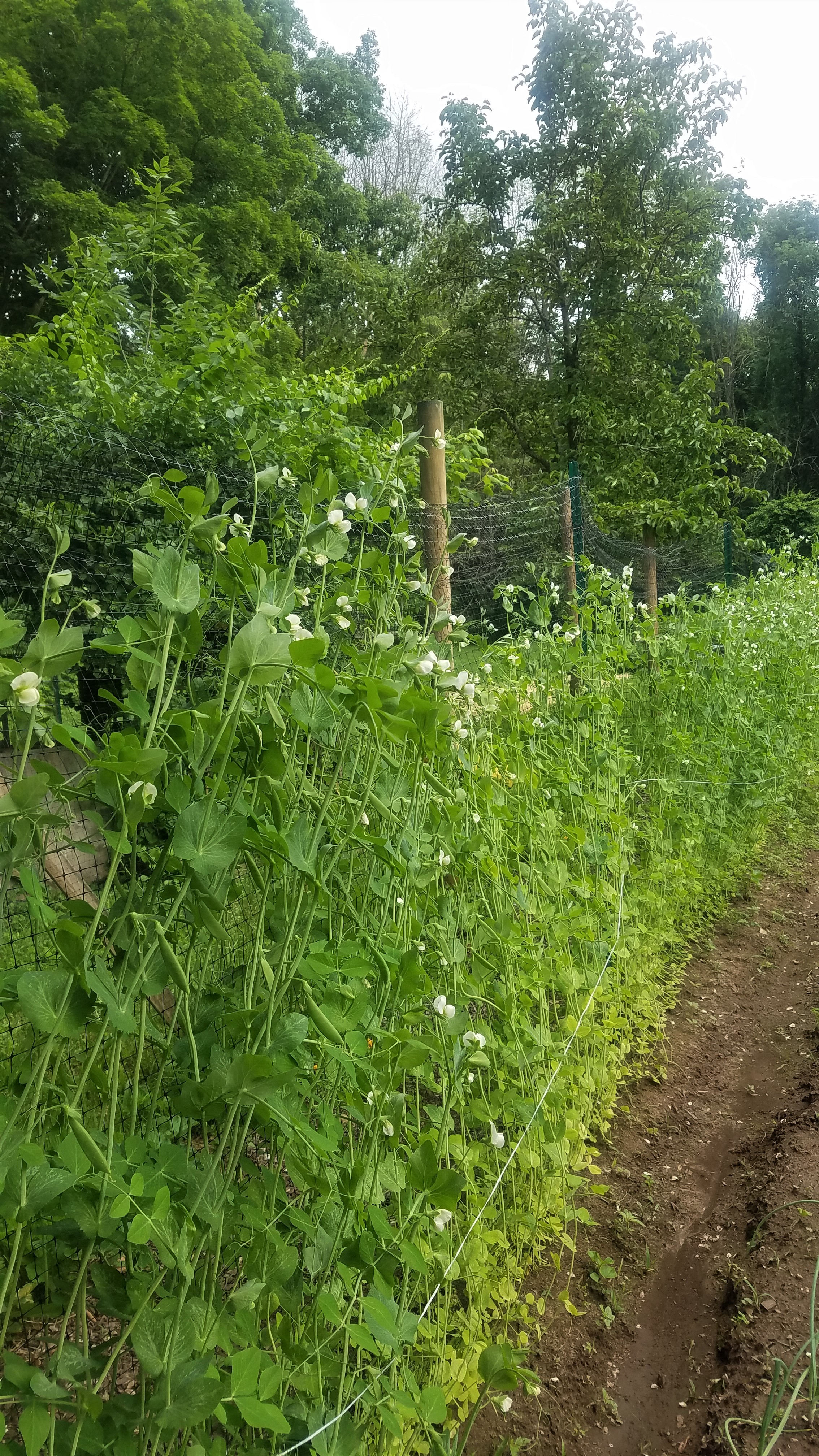 Looking past the cut flower bed towards the kiwi and grape arbors