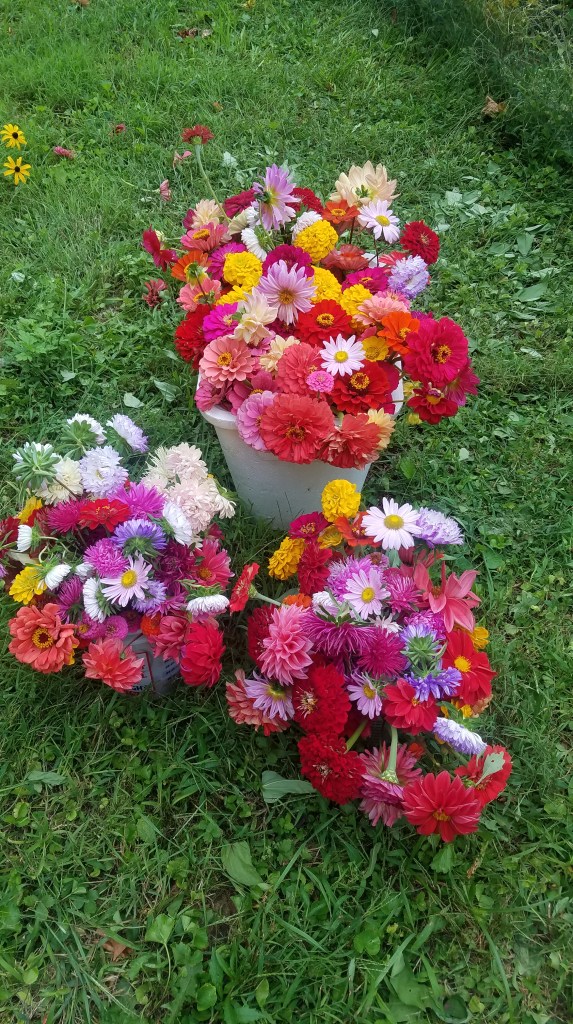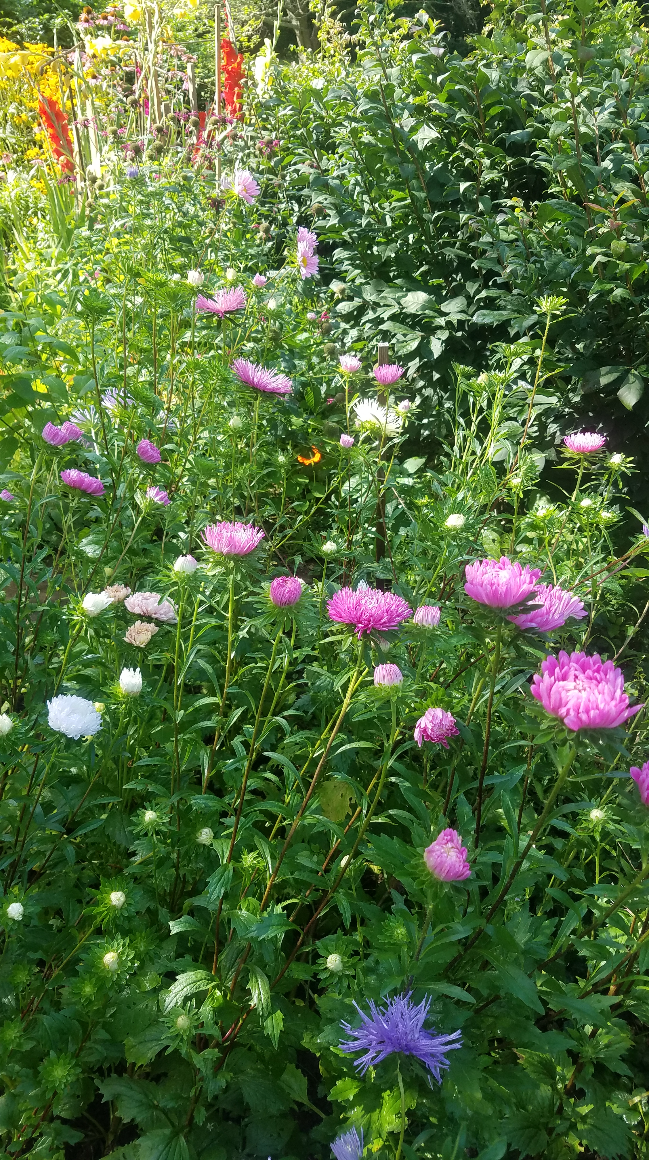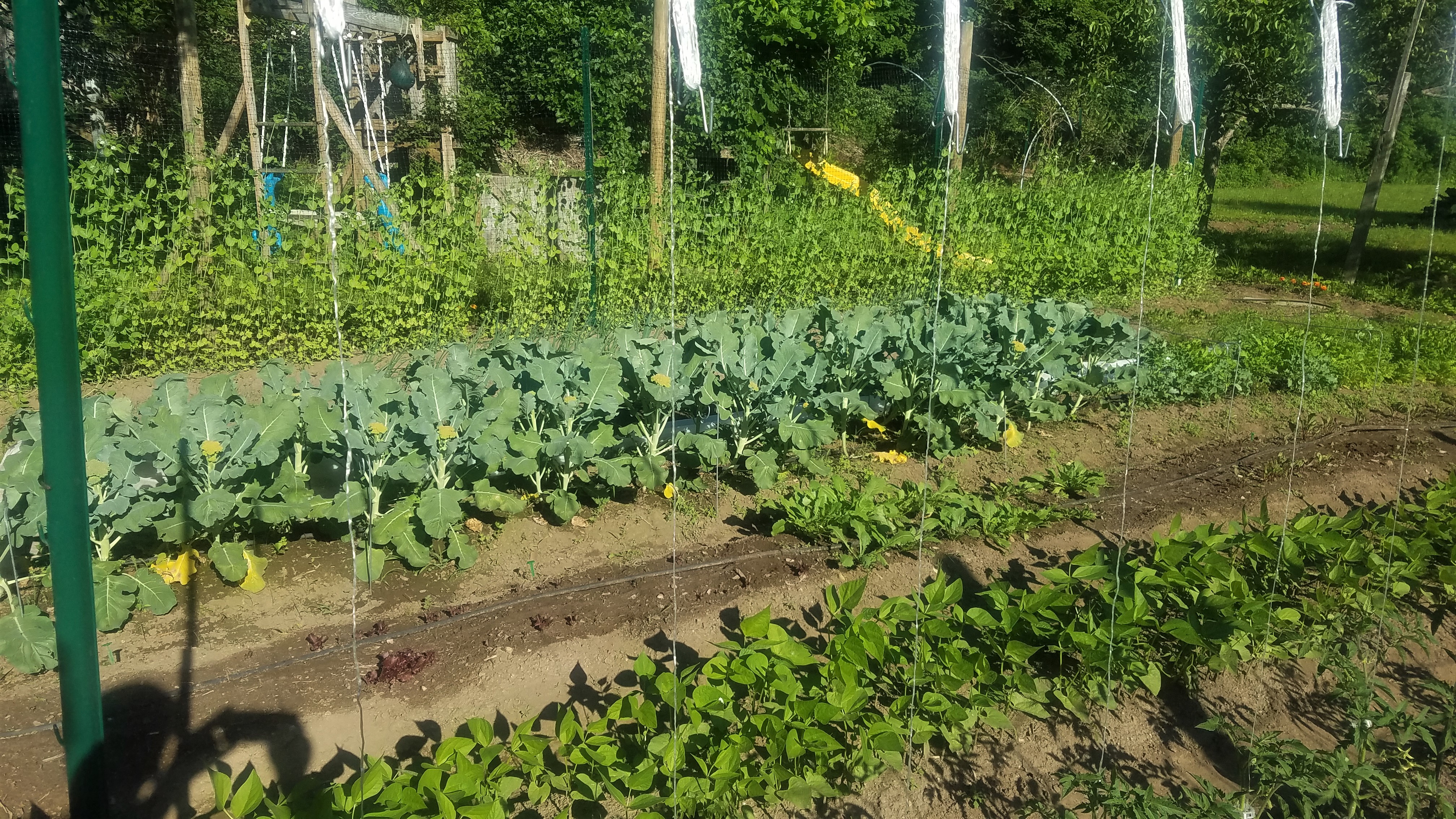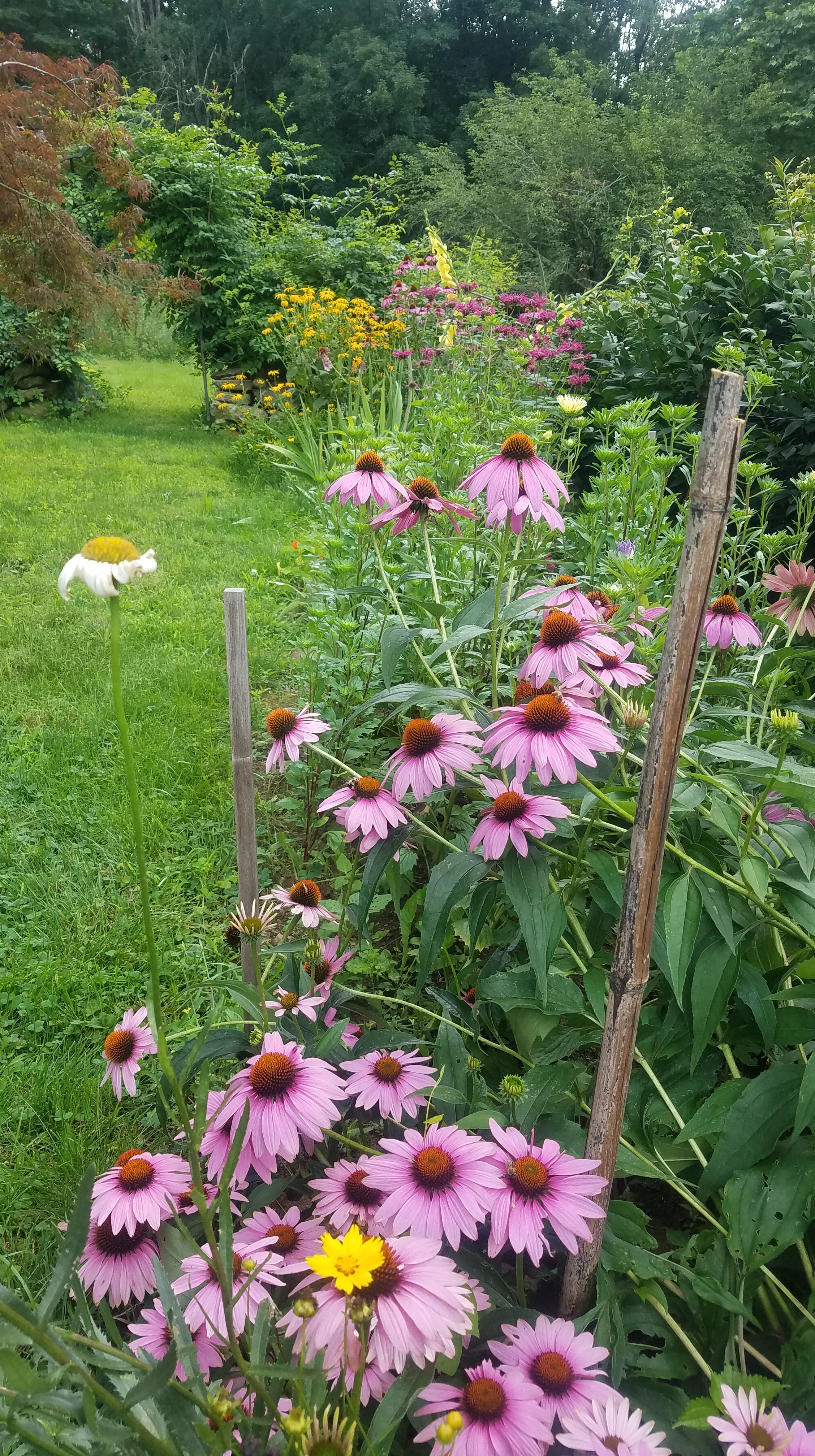 Looking past the cut flower bed towards the kiwi and grape arbors